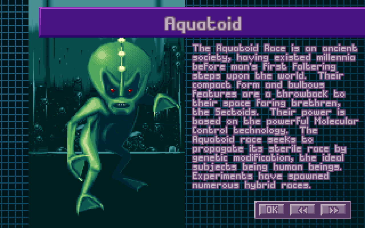 The Aquatoid Race is an ancient society, having existed millennia before man's first faltering steps upon the world. Their compact form and bulbous features are a throwback to their space faring brethren, the Sectoids. Their power is based on the powerful Molecular Control technology. The Aquatoid race seeks to propagate its sterile race by genetic modification, the ideal subjects being human beings. Experiments have spawned numerous hybrid races.