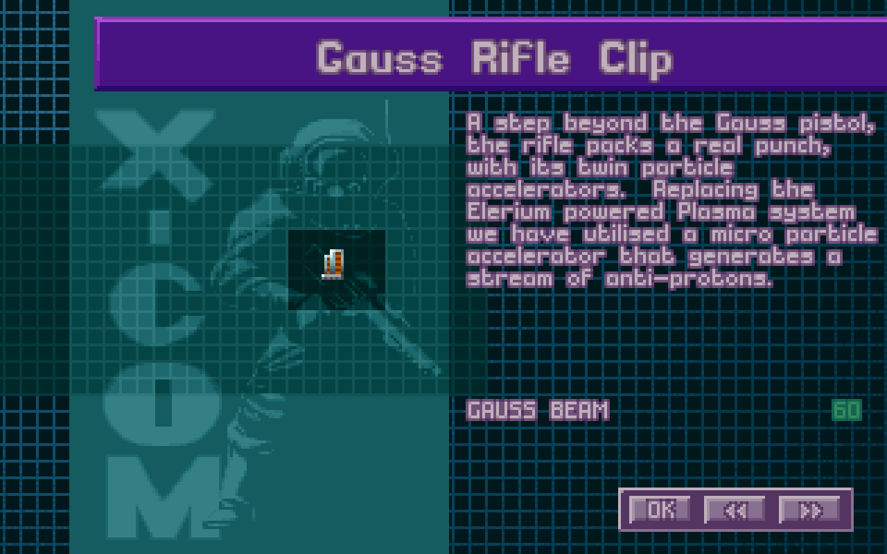 A step beyond the Gauss pistol, the rifle packs a real punch, with its twin particle accelerators. Replacing the Elerium powered Plasma system we have utilised a micro particle accelerator that generates a stream of anti-protons.