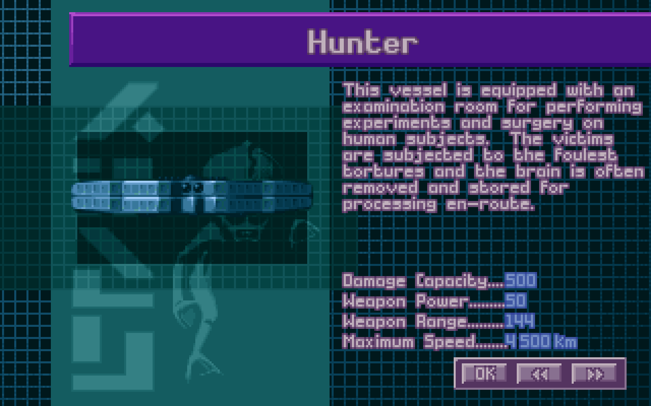 This vessel is equipped with an examination room for performing experiments and surgery on human subjects. The victims are subjected to the foulest tortures and the brain is often removed and stored for processing en-route.