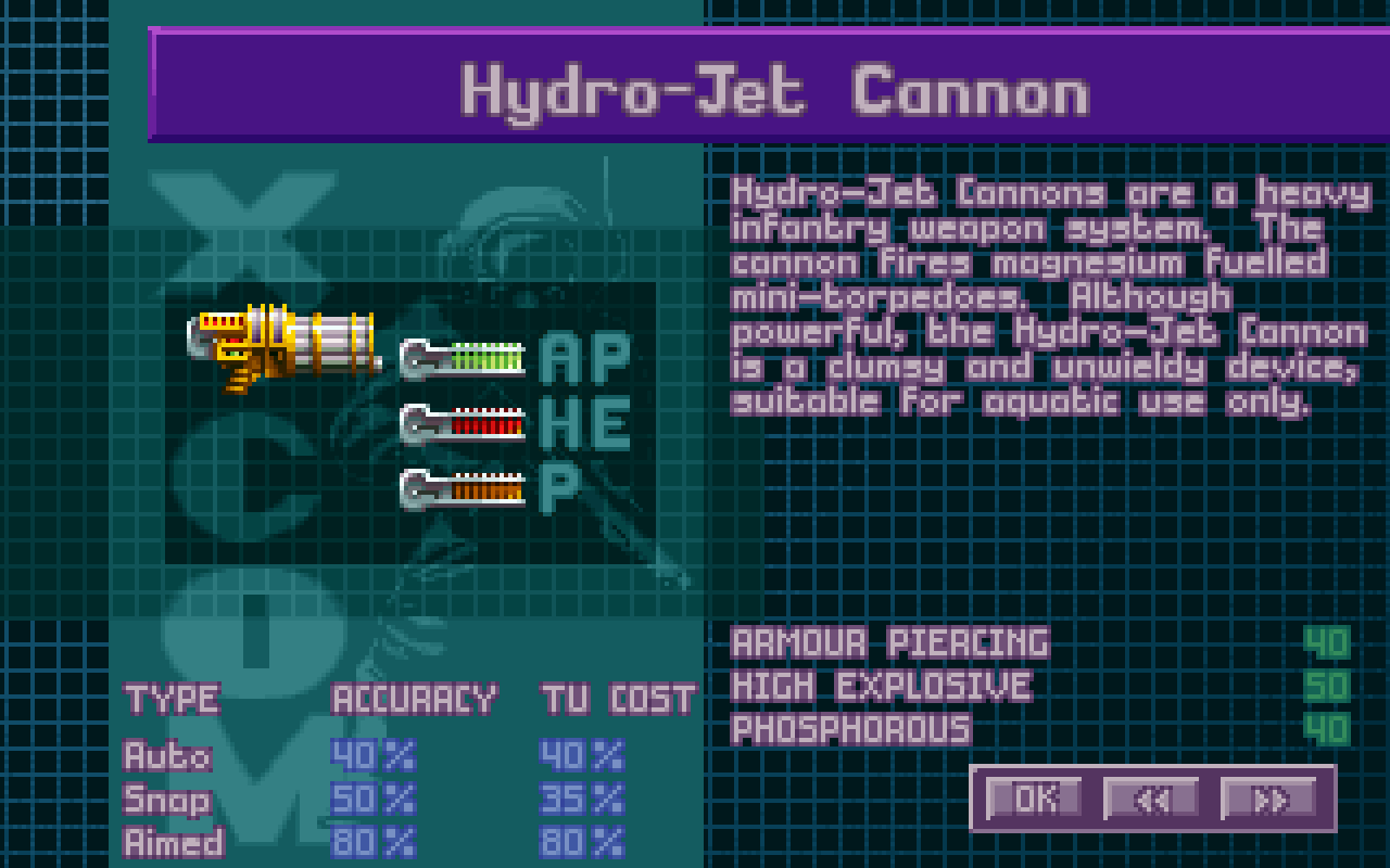 Hydro-Jet Cannons are a heavy infantry weapon system. The cannon fires magnesium fuelled mini-torpedoes. Although powerful, the Hydro-Jet Cannon is a clumsy and unwieldy device, suitable for aquatic use only.