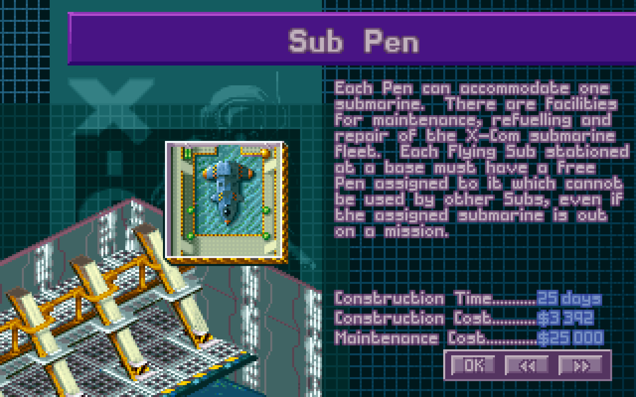 Each Pen can accommodate one submarine. There are facilities for maintenance, refuelling and repair of the X-Com submarine fleet. Each Flying Sub stationed at a base must have a free Pen assigned to it which cannot be used by other Subs, even if the assigned submarine is out on a mission.