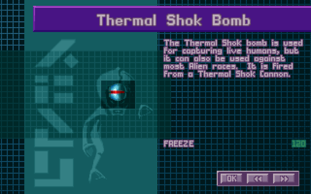 The Thermal Shok bomb is used for capturing live humans, but it can also be used against most Alien races. It is fired from a Thermal Shok Cannon.