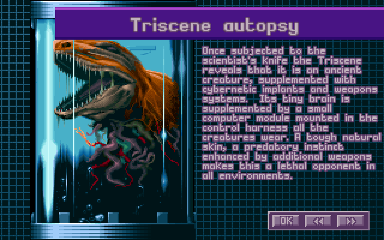 Once subjected to the scientist's knife the Triscene reveals that it is an ancient creature, supplemented with cybernetic implants and weapons systems. Its tiny brain is supplemented by a small computer module mounted in the control harness all the creatures wear. A tough natural skin, a predatory instinct enhanced by additional weapons makes this a lethal opponent in all environments.